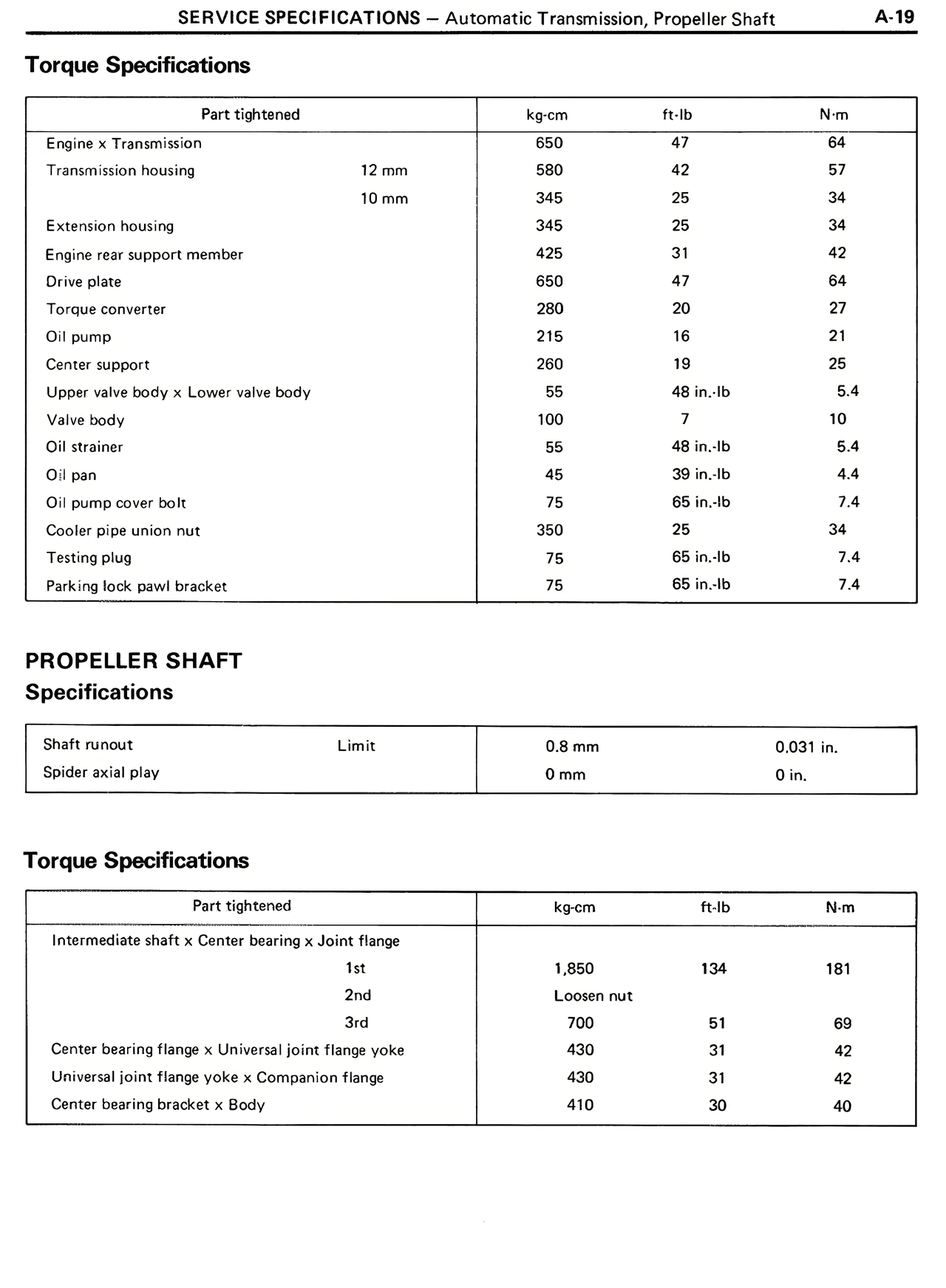 SERVICE SPECIFICATIONS — Automatic Transmission, Propeller Shaft A-19