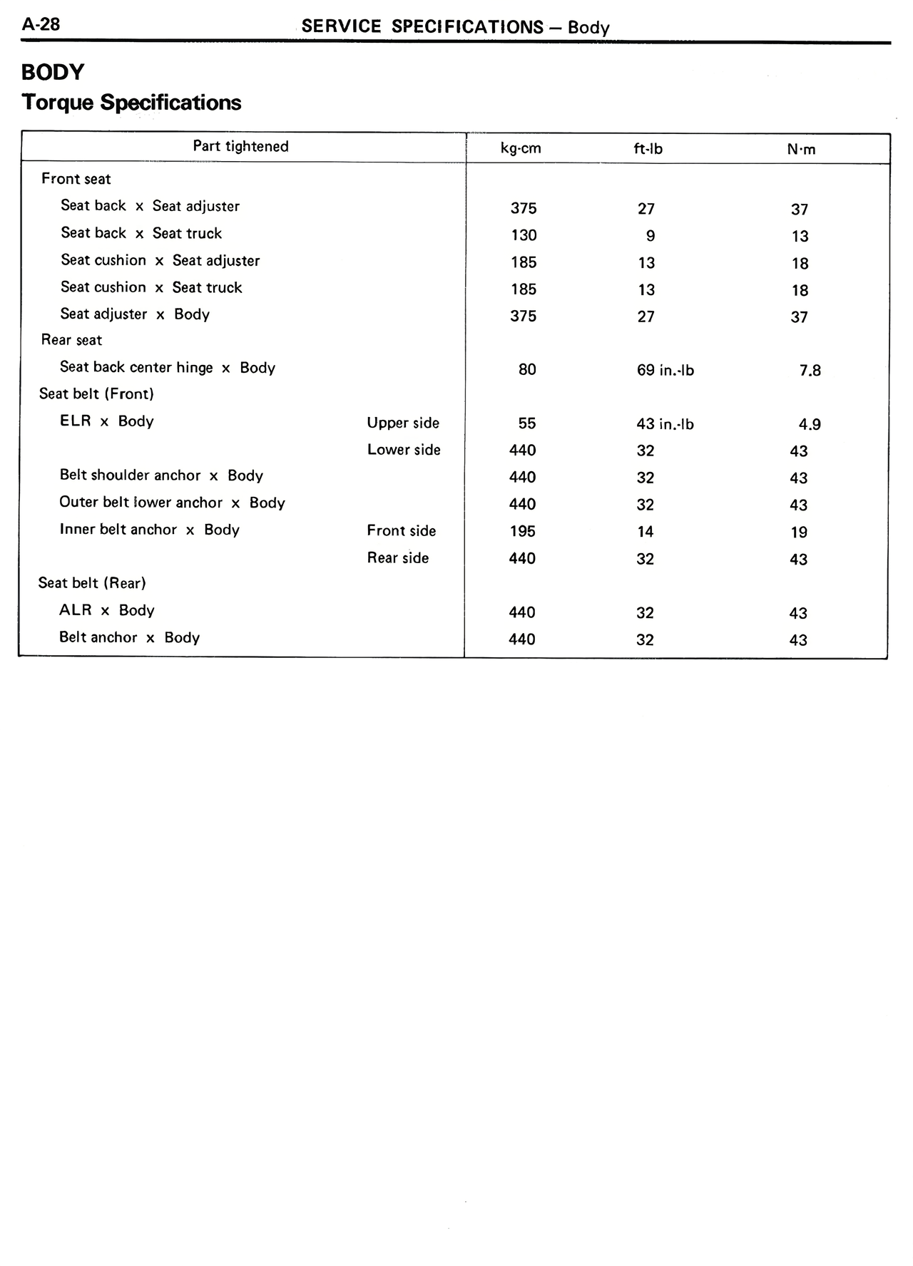 Seat back center hinge × Body 80 69 in.·lb 7.8