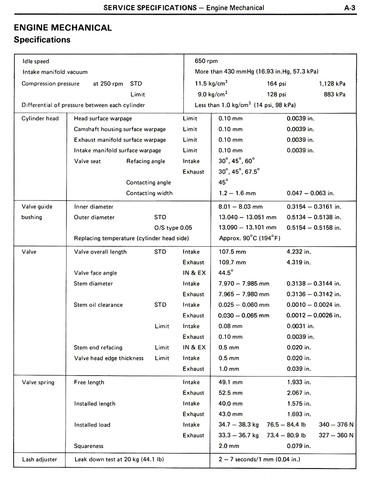 Lash adjuster Leak down test at 20 kg (44.1 lb) 2 – 7 seconds/1 mm (0.04 in.)