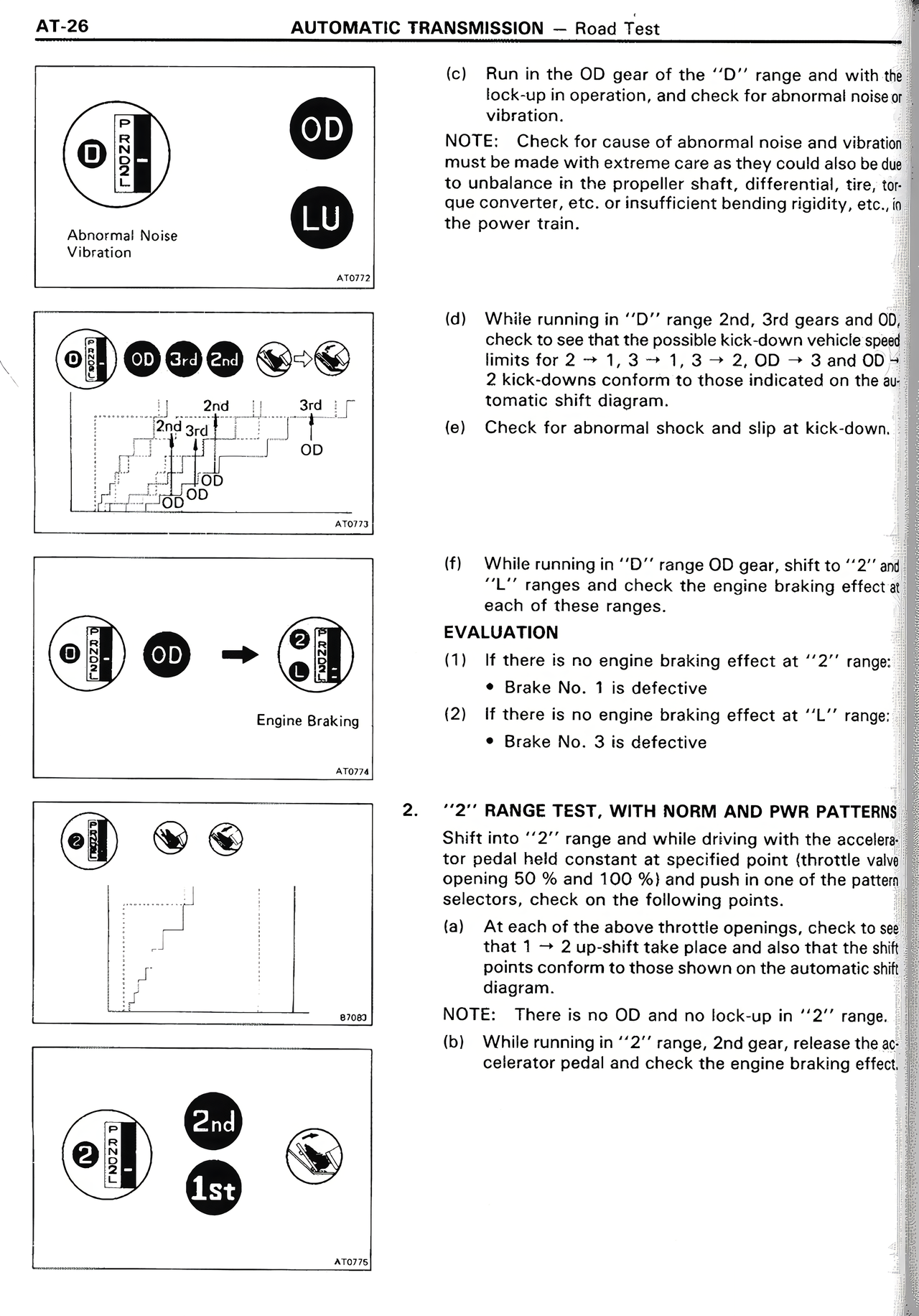 (f) While running in "D" range OD gear, shift to "2" and "L" ranges and check the engine braking effect at each of these ranges.