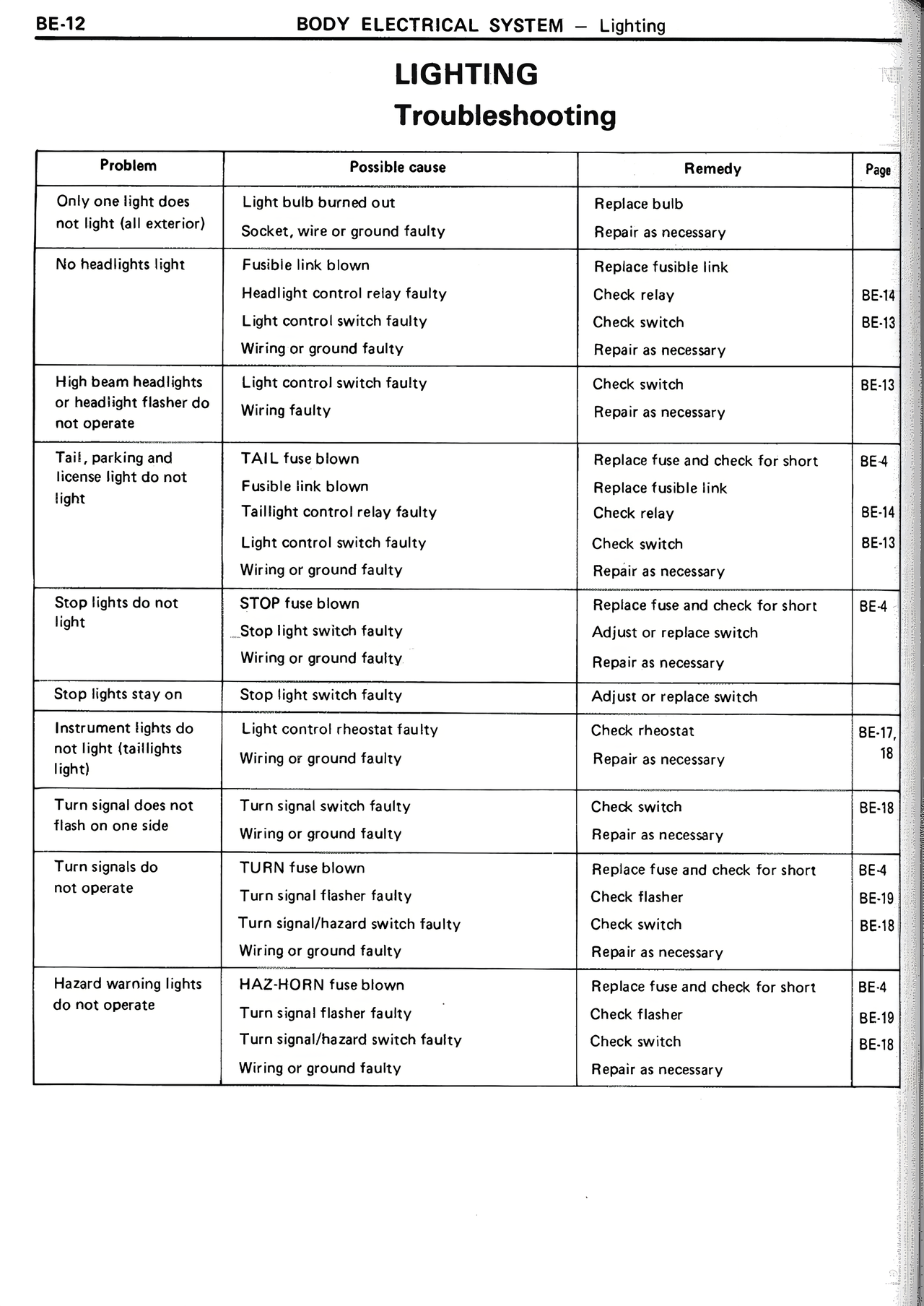 | Light control switch faulty | Check switch | BE-13