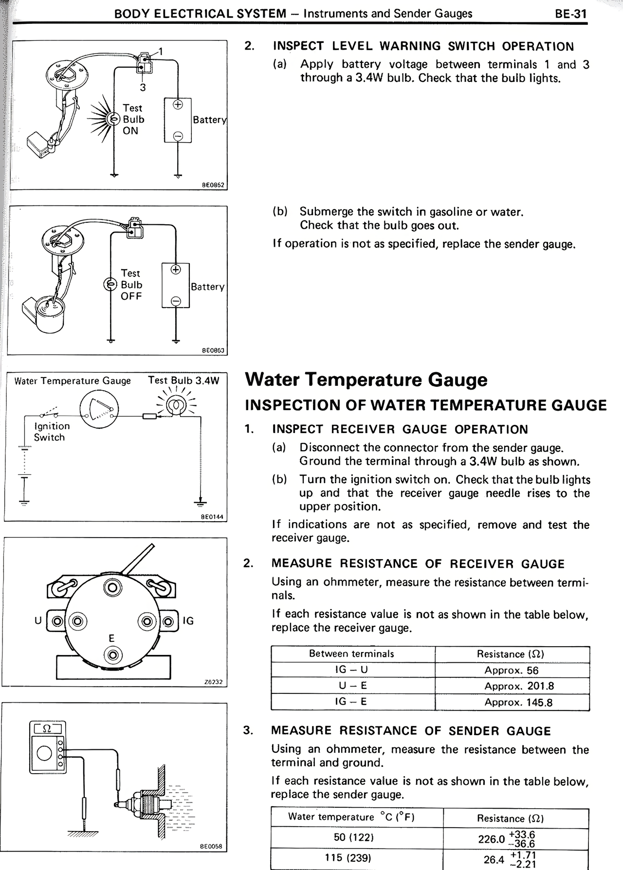 (b) Turn the ignition switch on. Check that the bulb lights up and that the receiver gauge needle rises to the upper position.