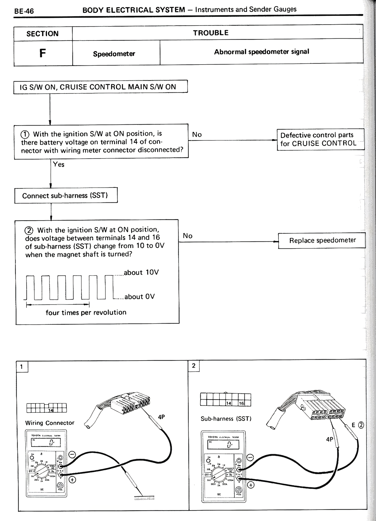② With the ignition S/W at ON position, does voltage between terminals 14 and 16 of sub-harness (SST) change from 10 to 0V when the magnet shaft is turned?