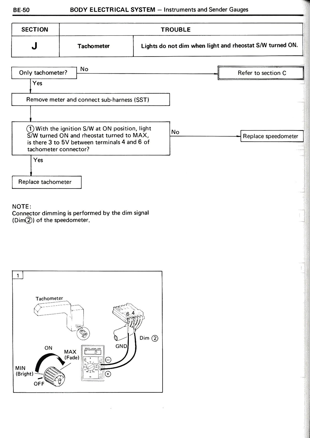 J | Tachometer | Lights do not dim when light and rheostat S/W turned ON.