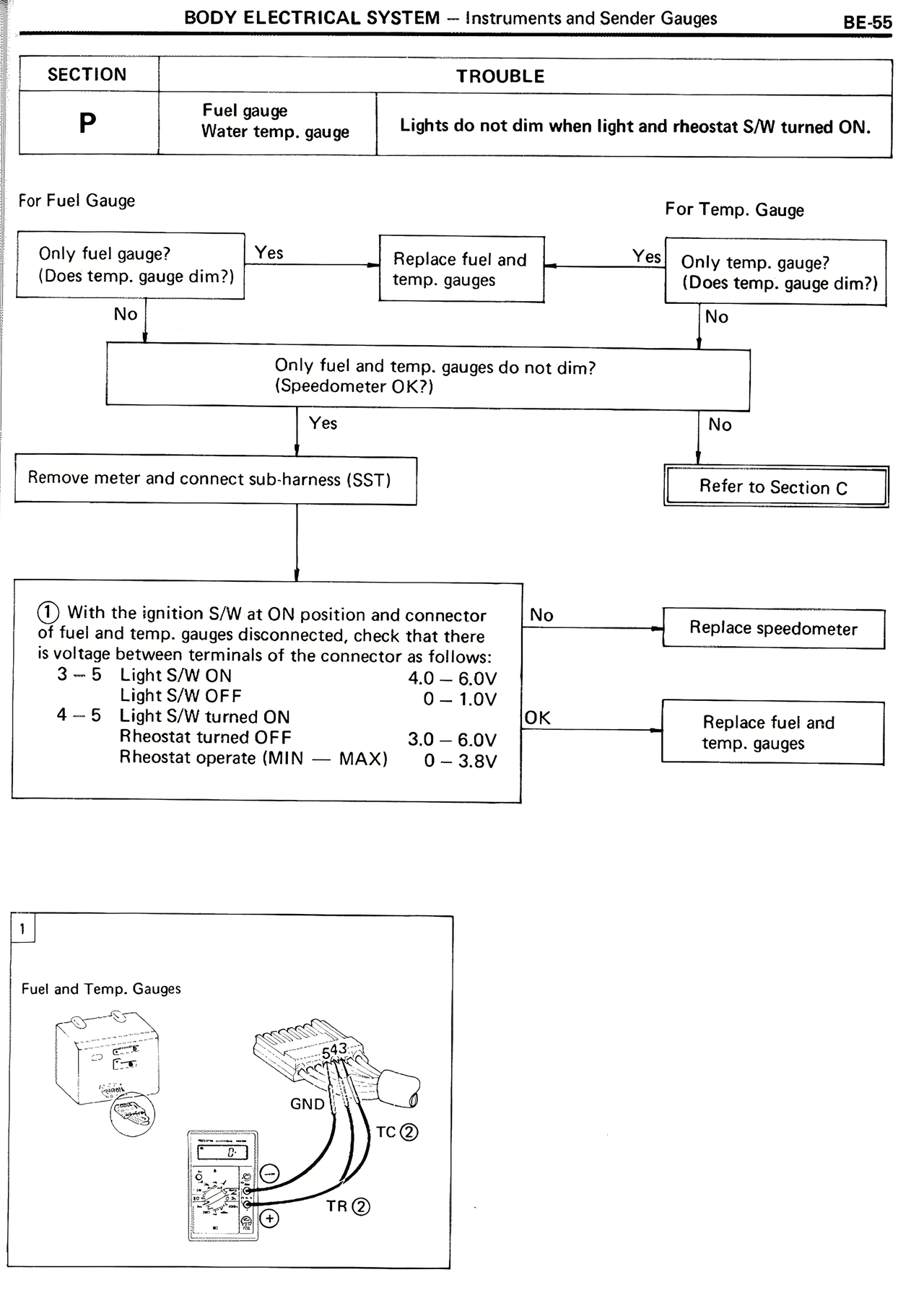 [Diagram showing fuel and temp gauges with meter connections labeled GND, TC②, and TR②]