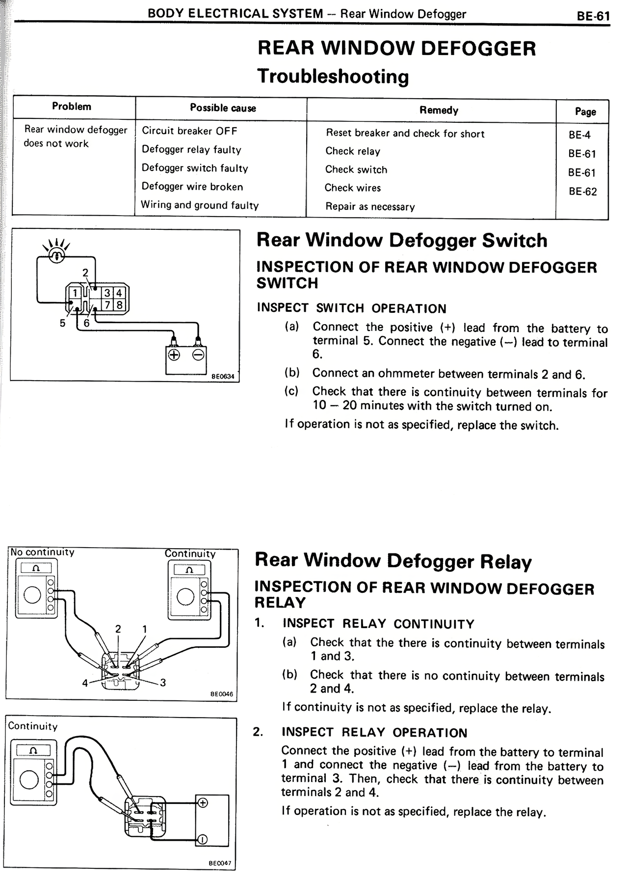 Rear window defogger does not work | Circuit breaker OFF | Reset breaker and check for short | BE-4