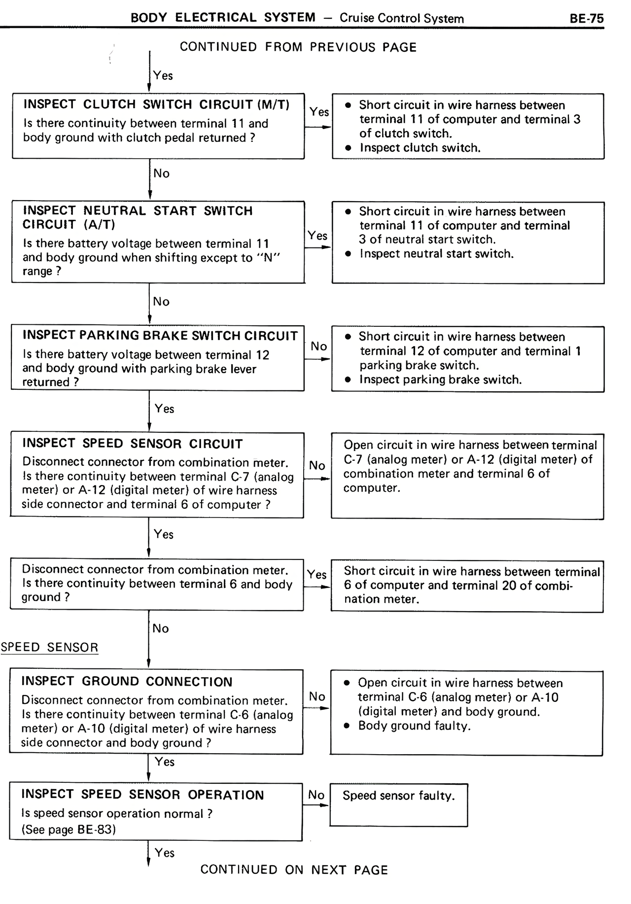 No → Open circuit in wire harness between terminal C-7 (analog meter) or A-12 (digital meter) and combination meter and terminal 6 of computer.