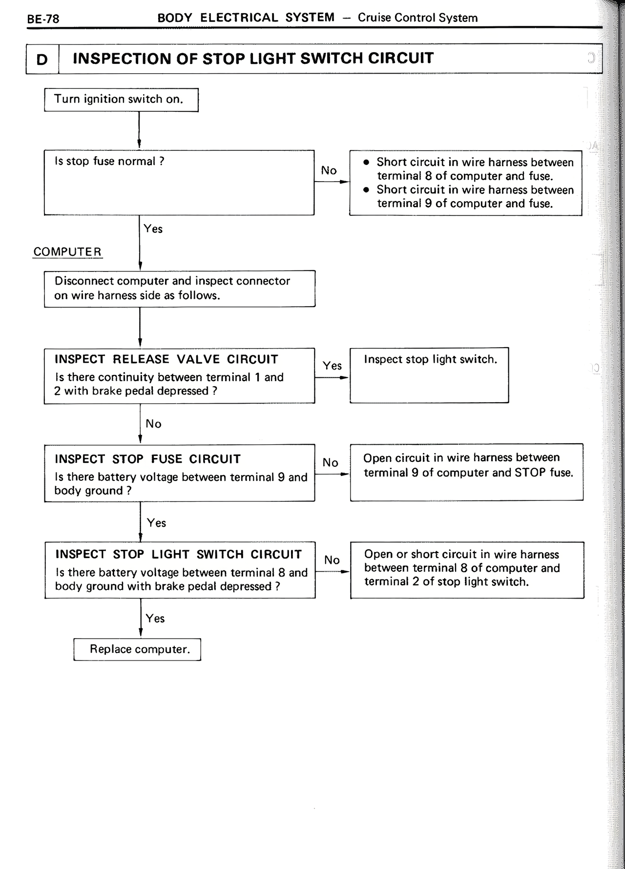 Open or short circuit in wire harness between terminal 8 of computer and terminal 2 of stop light switch.