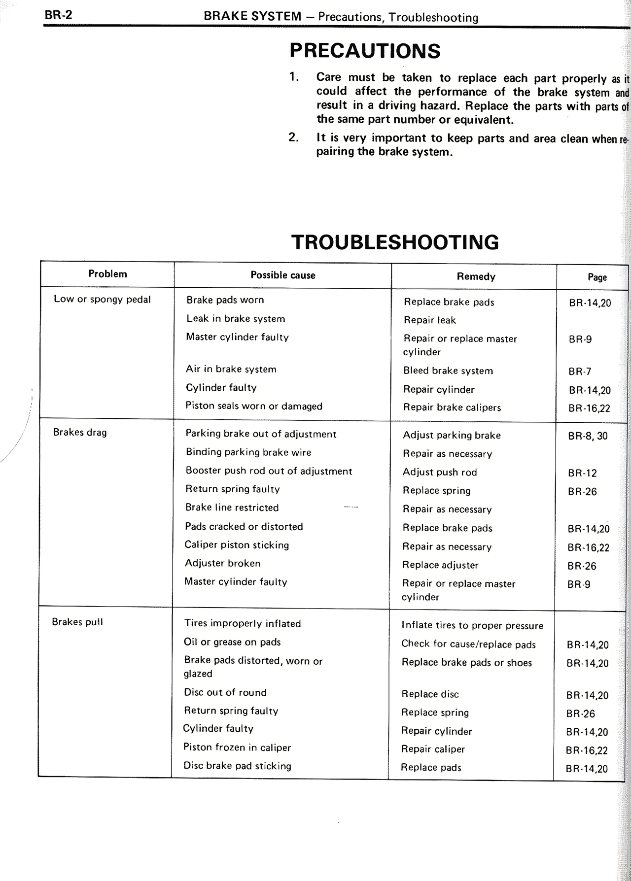 | Oil or grease on pads | Check for cause/replace pads | BR-14,20