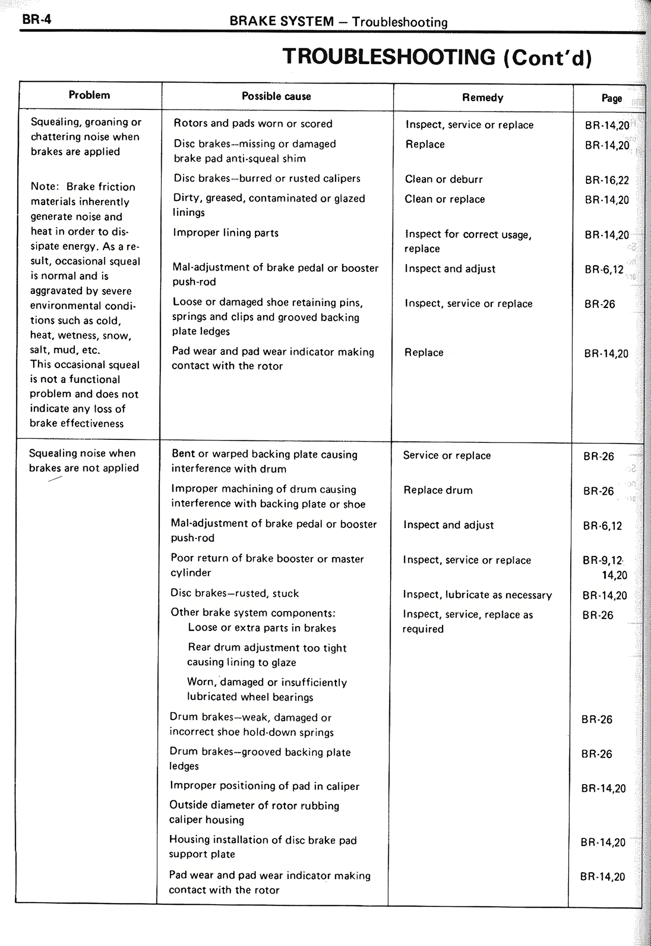 Rotors and pads worn or scored | Inspect, service or replace | BR-14,20