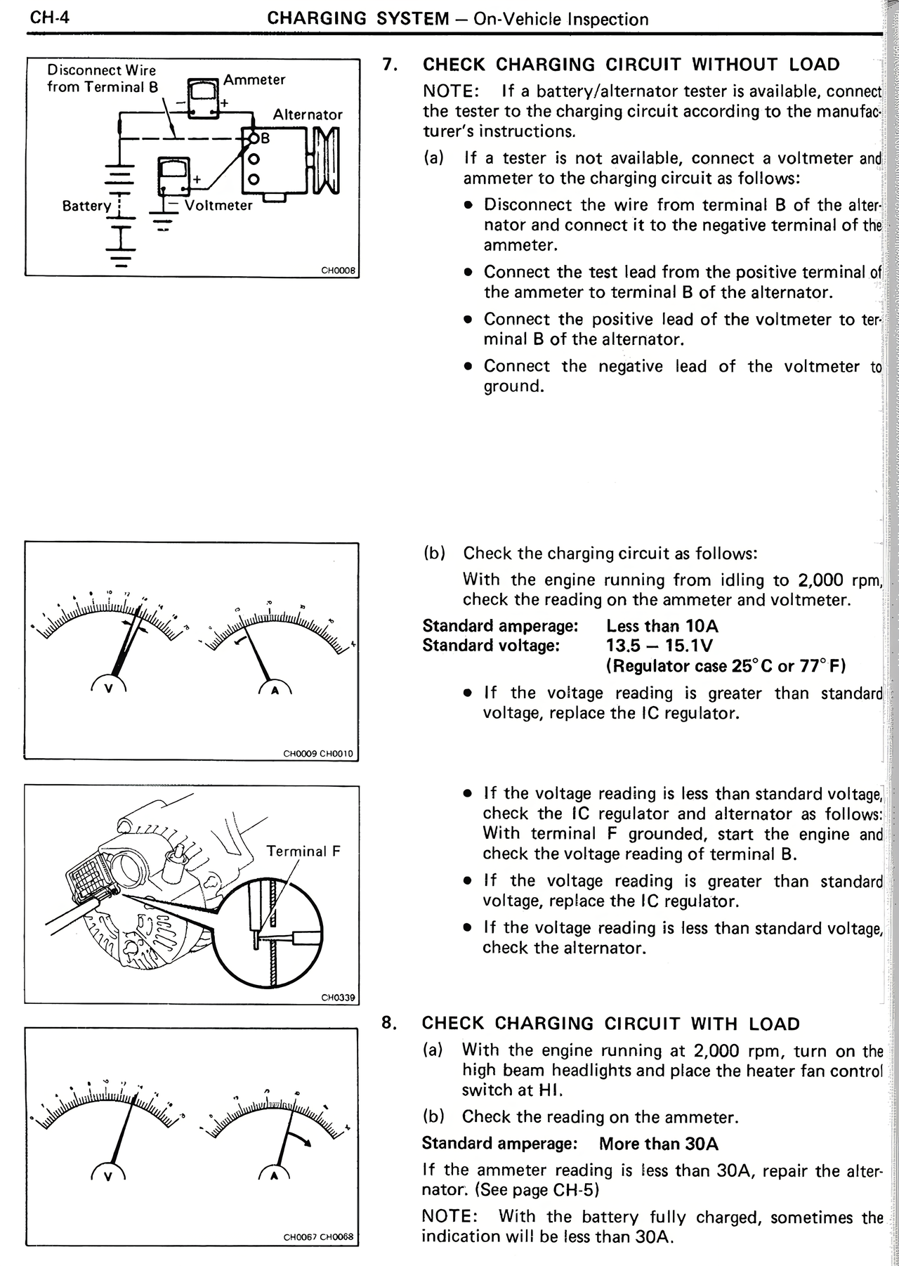• If the voltage reading is less than standard voltage, check the IC regulator and alternator as follows: With terminal F grounded, start the engine and check the voltage reading (terminal B).
