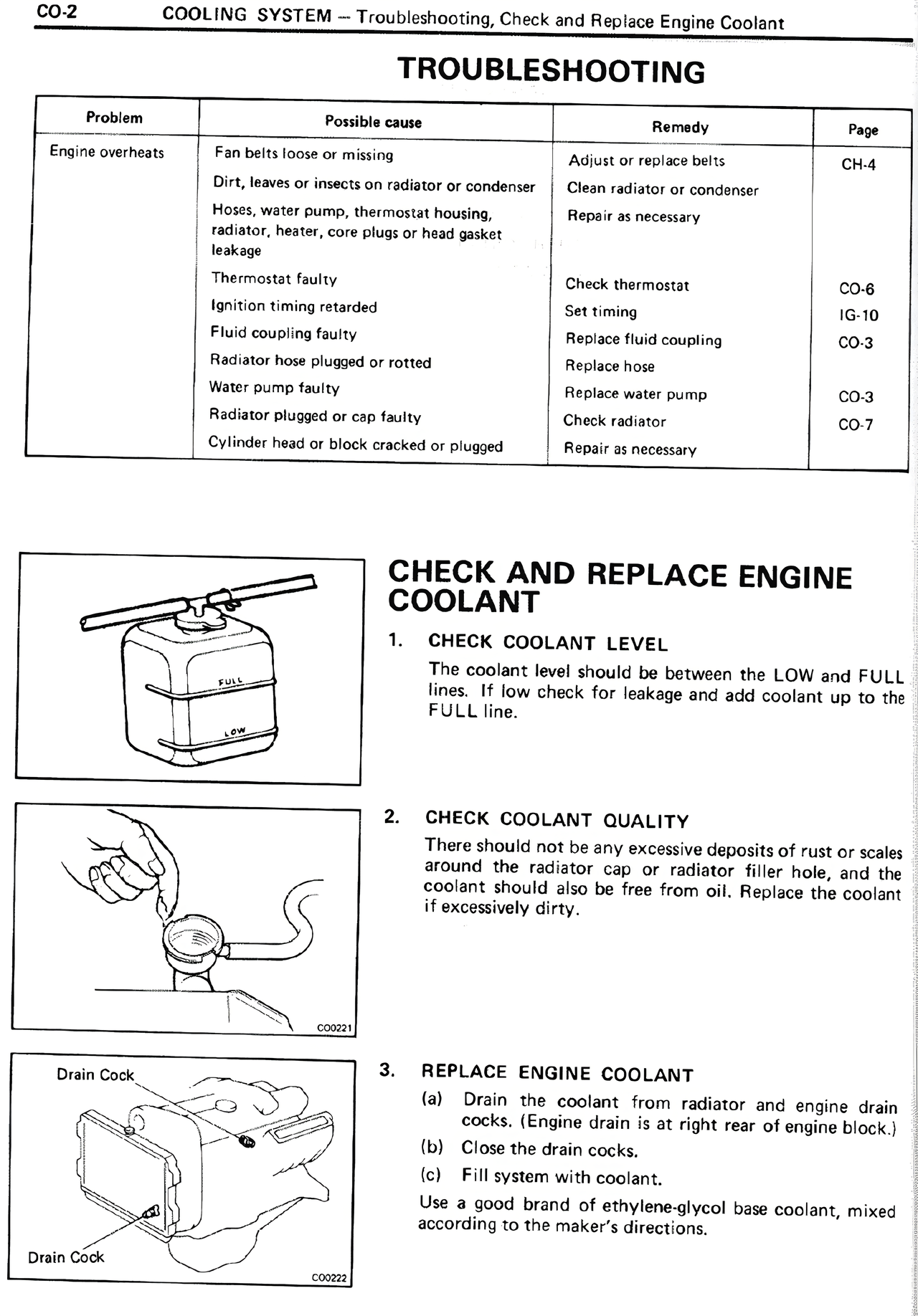 | Radiator plugged or cap faulty | Check radiator | CO-7