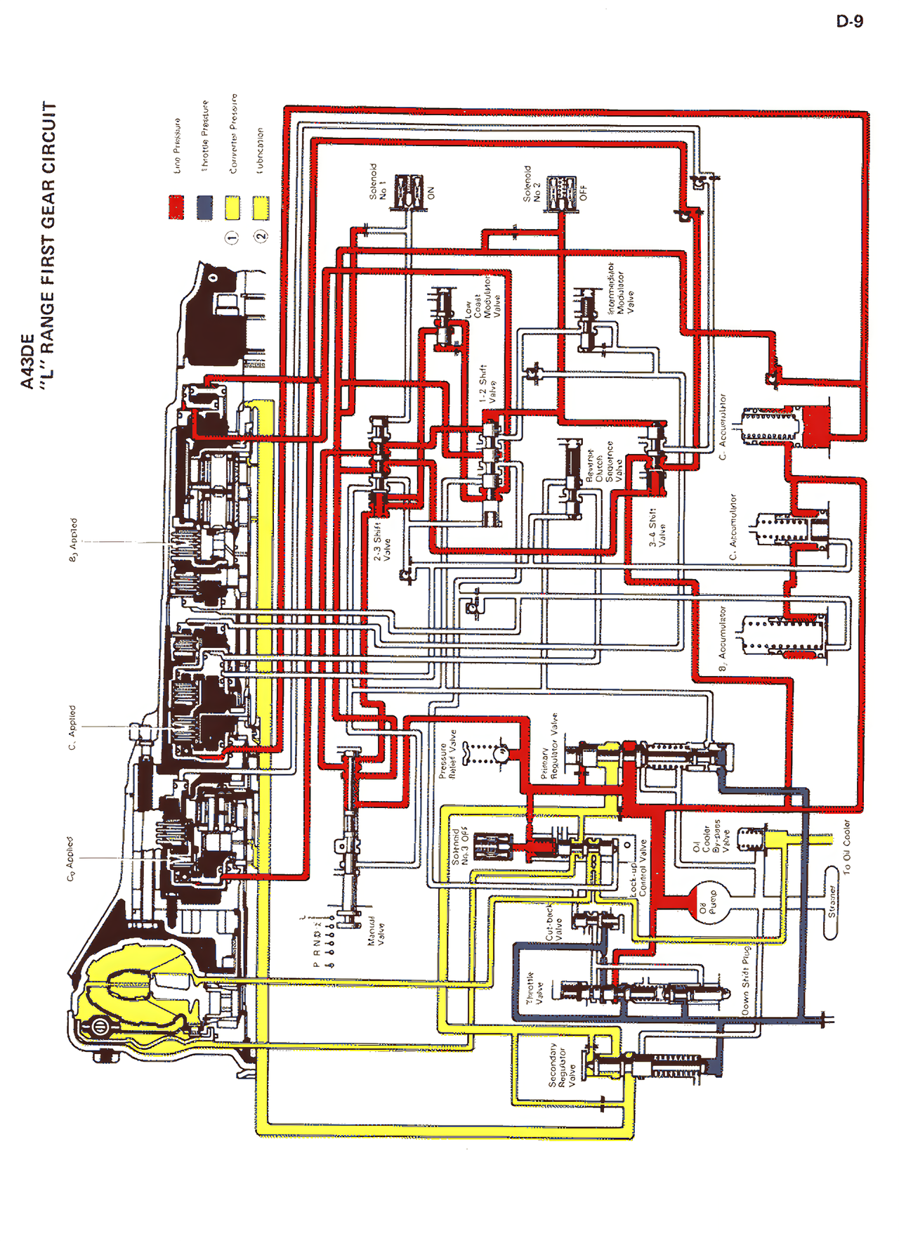 D-9 4-AGZE 1-2 RANGE FIRST GEAR CIRCUIT Legend: Red Purple/Black Yellow/Blue Yellow/Green Battery Starting Charging Ignition Headlights Gauge A/C