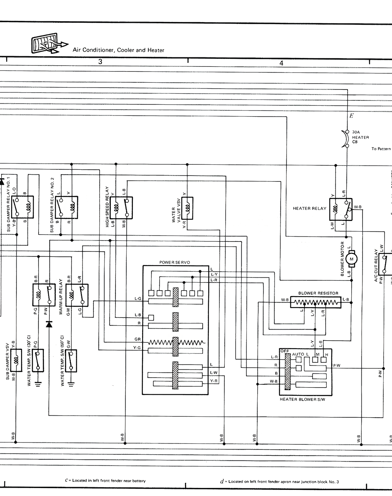 Air Conditioner, Cooler and Heater 3 4 To Return 30A FUSIBLE LINK OB HEATER RELAY BLOWER RESISTOR POWER 1st SERVO HEATER BLOWER S/W C = Located in MFL fuse/I fender near battery d = Located on left front fender apron near junction block No. 3