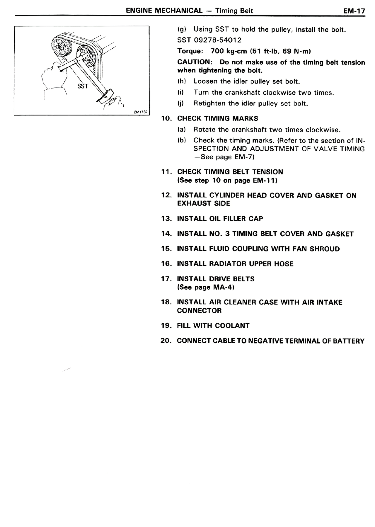 (b) Check the timing marks. (Refer to the section of IN-SPECTION AND ADJUSTMENT OF VALVE TIMING — See page EM-7)