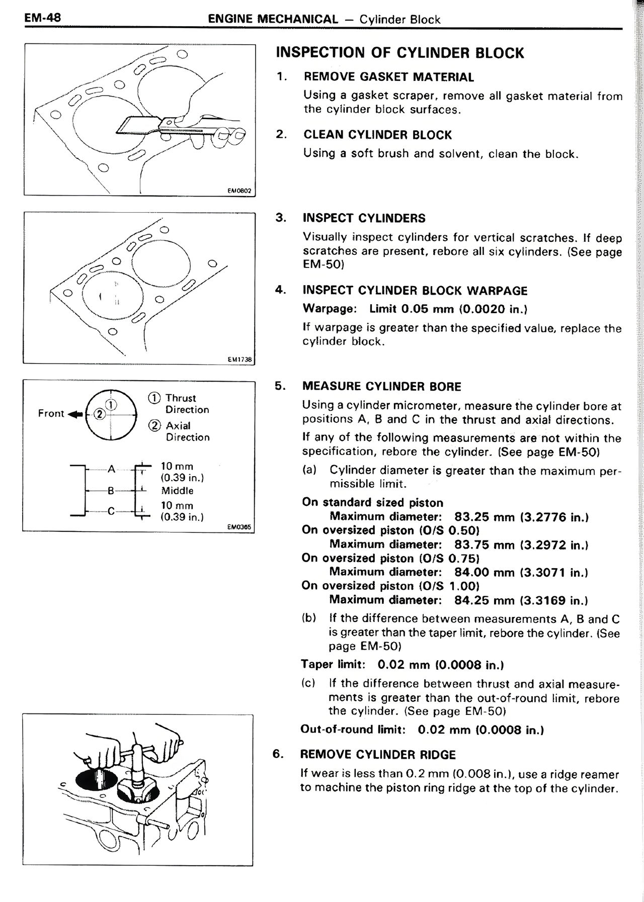 (c) If the difference between thrust and axial measurements is greater than the out-of-round limit, rebore the cylinder. (See page EM-50)