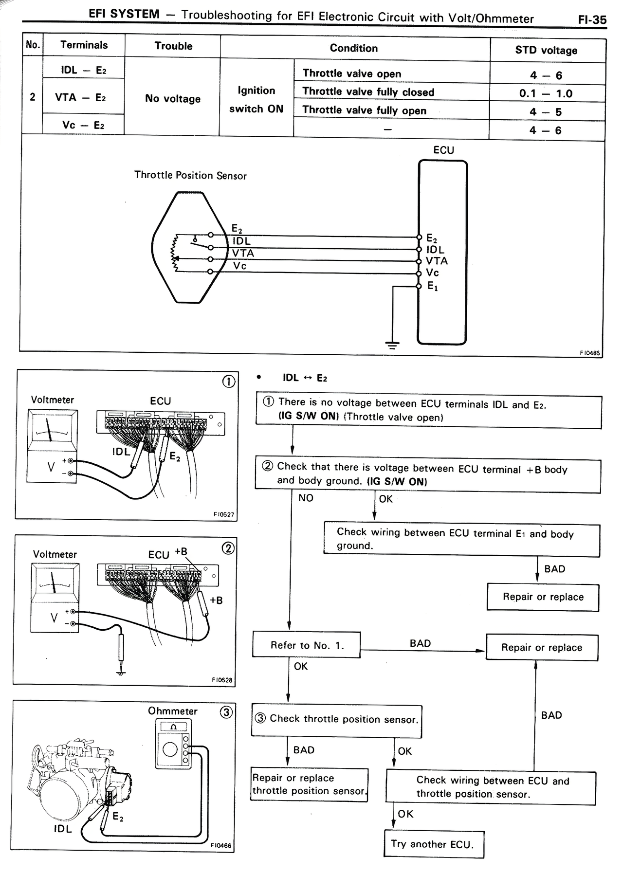 ① There is no voltage between ECU terminals IDL and E₂. (IG S/W ON) (Throttle valve open)