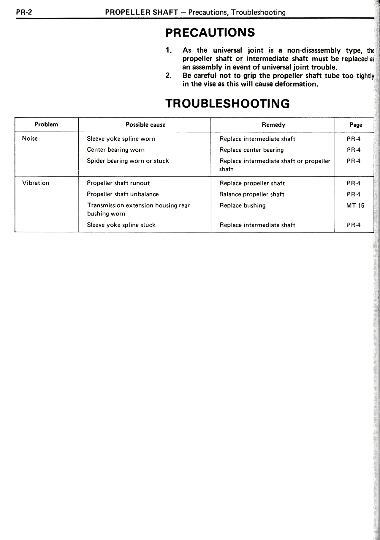 | Spider bearing worn or stuck | Replace intermediate shaft or propeller shaft | PR-4