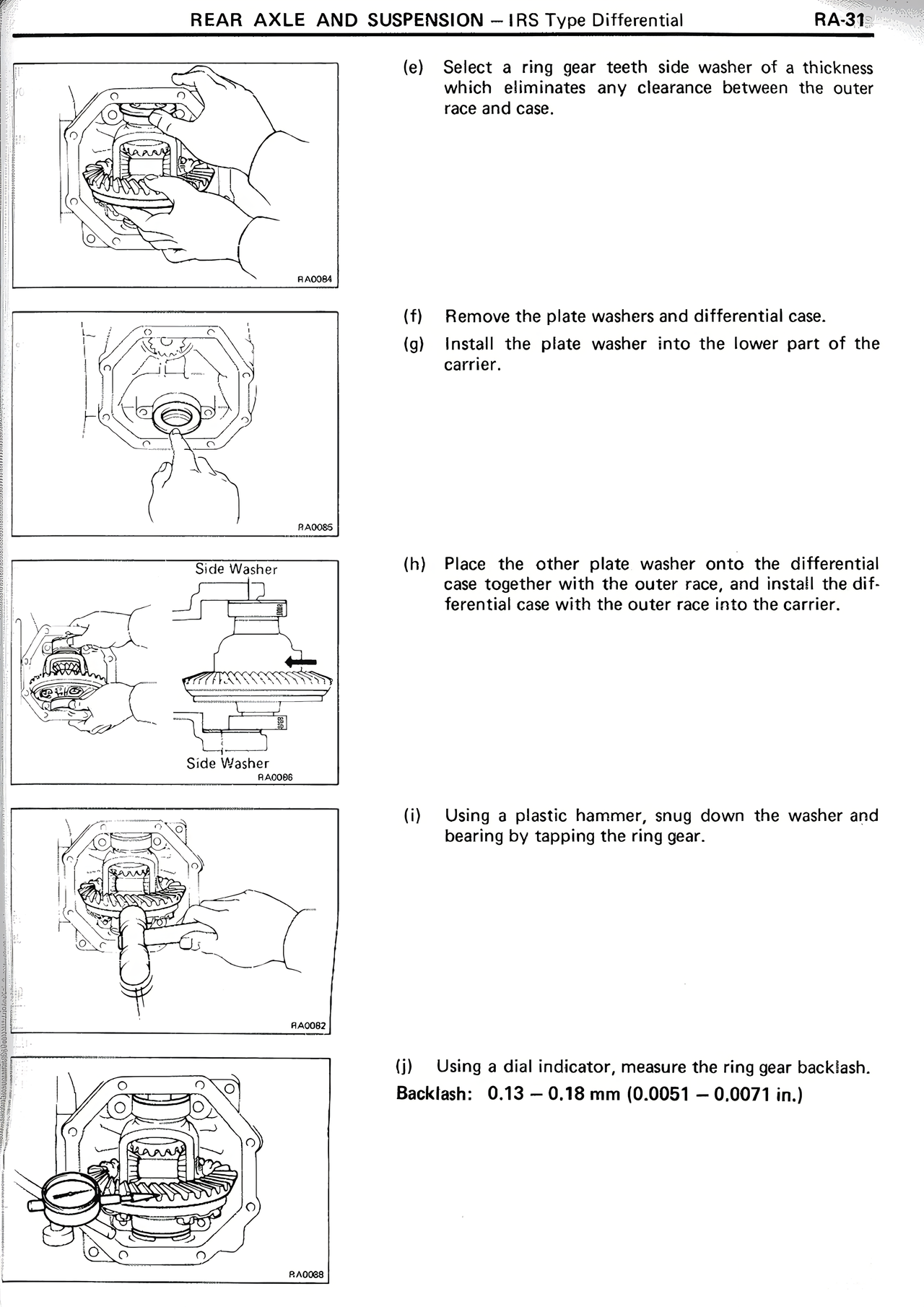 (e) Select a ring gear teeth side washer of a thickness which eliminates any clearance between the outer race and case.