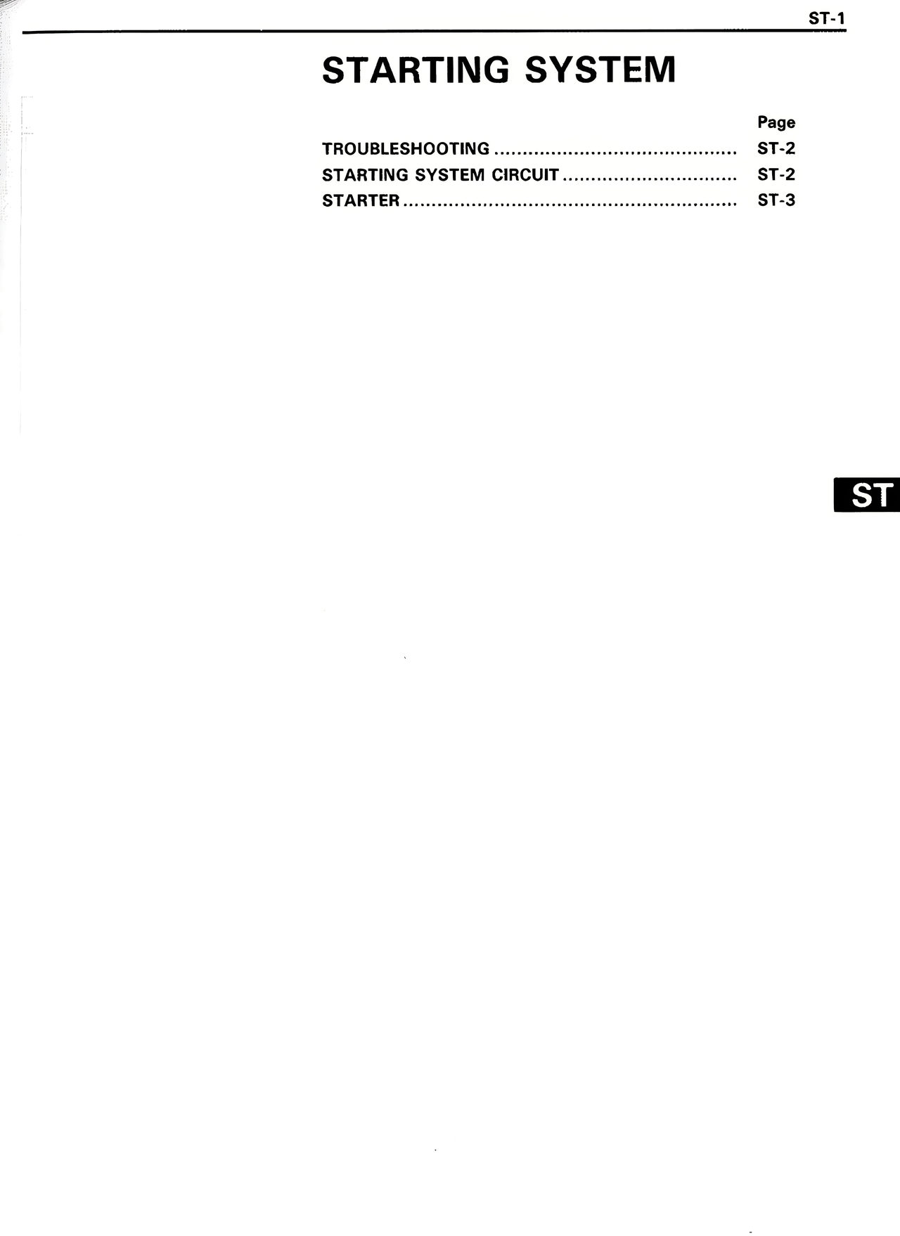 STARTING SYSTEM Page TROUBLESHOOTING ........................................... ST-2 STARTING SYSTEM CIRCUIT ............................... ST-2 STARTER ........................................................... ST-3