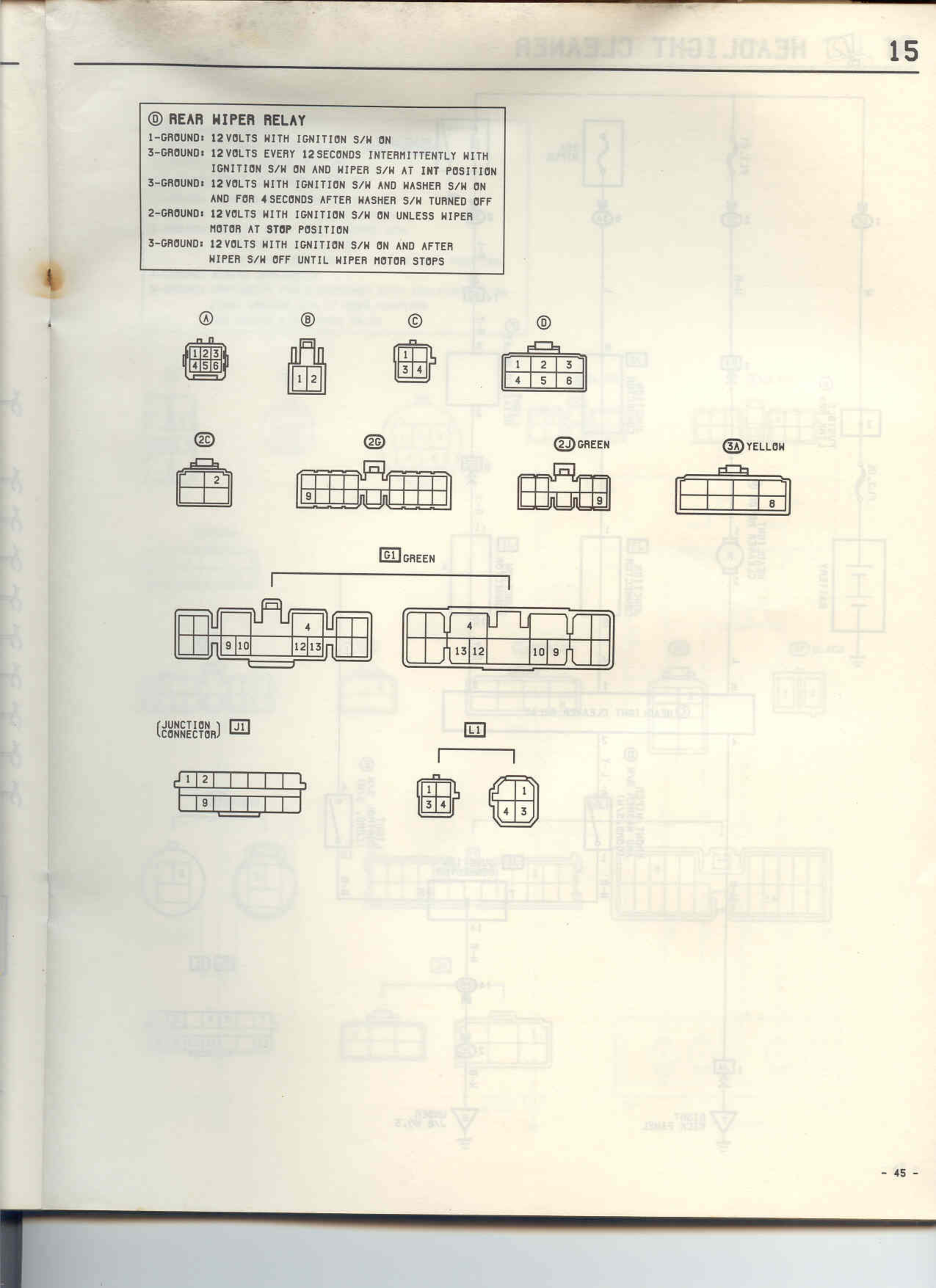 3-GROUND: 12 VOLTS WITH IGNITION S/W ON AND AFTER WIPER S/W OFF UNTIL WIPER MOTOR STOPS