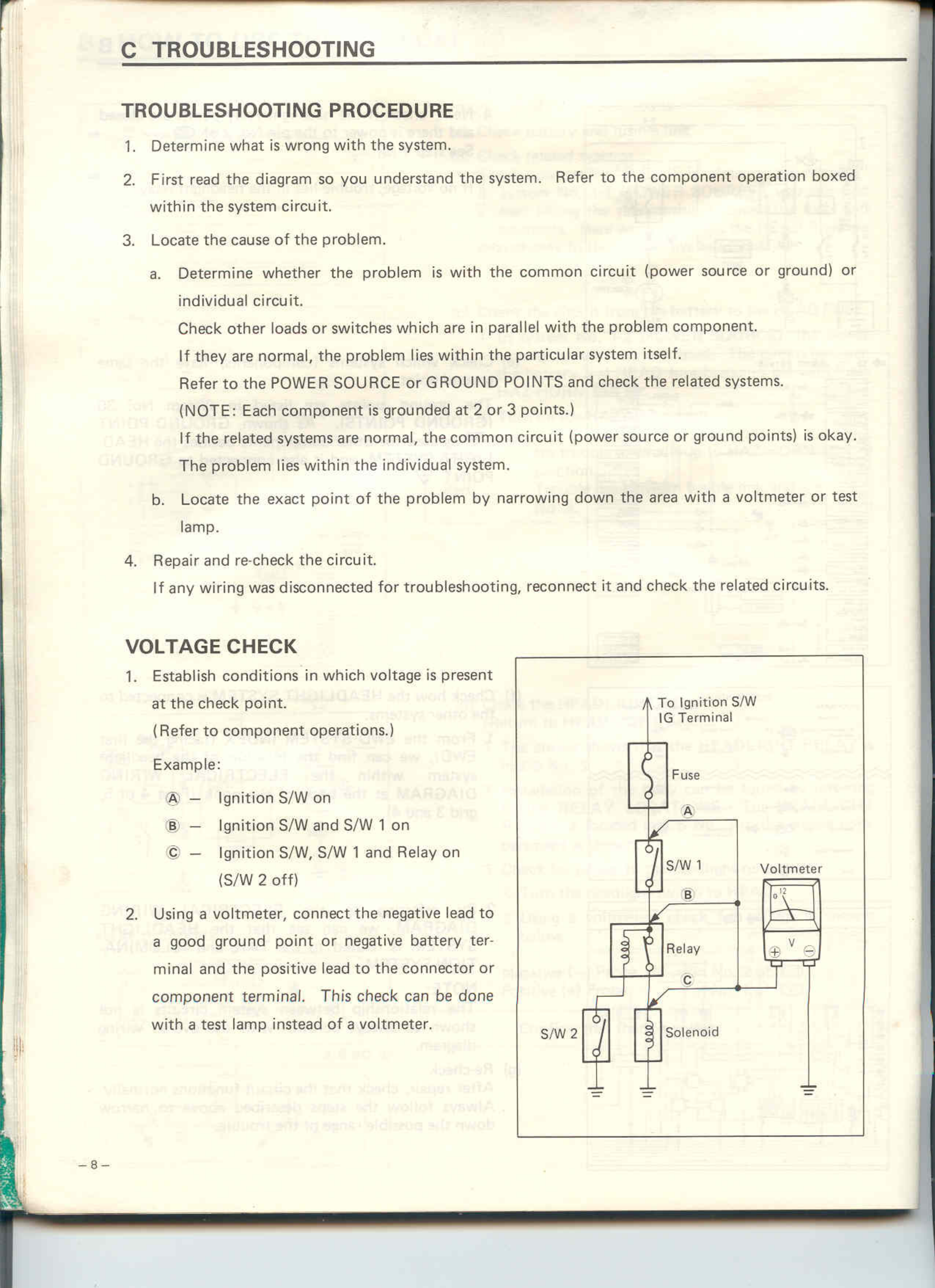 [DIAGRAM showing circuit with: To Ignition S/W IG Terminal, Fuse, S/W 1, Relay, Solenoid, S/W 2, Voltmeter, with points A, B, C marked and ground symbols]
