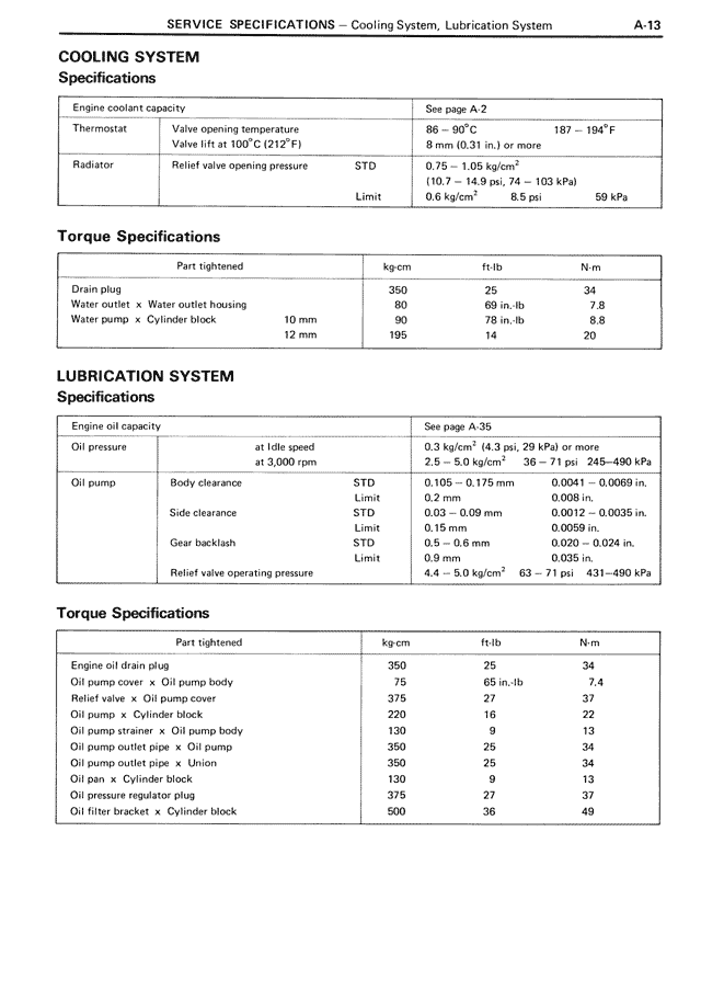 Oil pressure at Idle speed 0.3 kg/cm² (4.3 psi, 29 kPa) or more