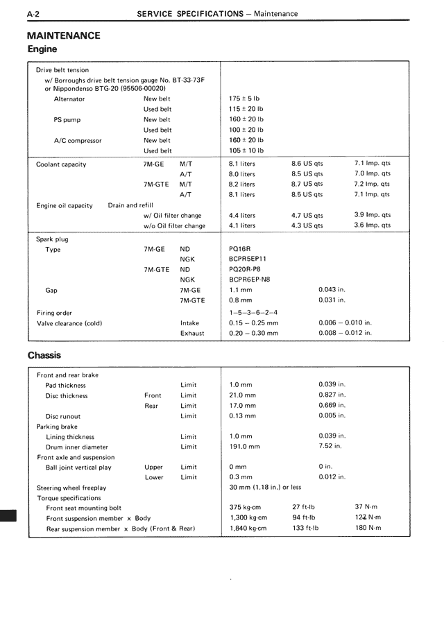 7M-GTE M/T 8.2 liters 8.7 US qts 7.2 Imp. qts