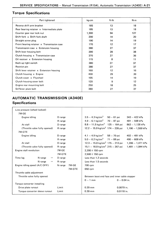 SERVICE SPECIFICATIONS — Manual Transmission (R154), Automatic Transmission (A340E) A-21