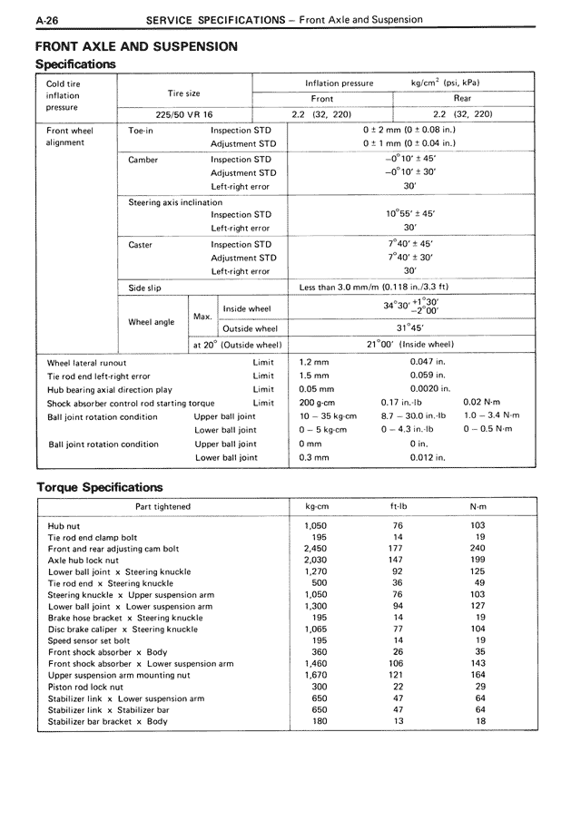 kg/cm² (psi, kPa): Rear 2.2 (32, 220)