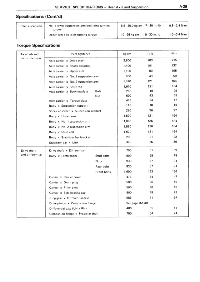 | Upper arm ball joint turning torque | 10–35 kg·cm 9–30 in.·lb | 1.0–3.4 N·m