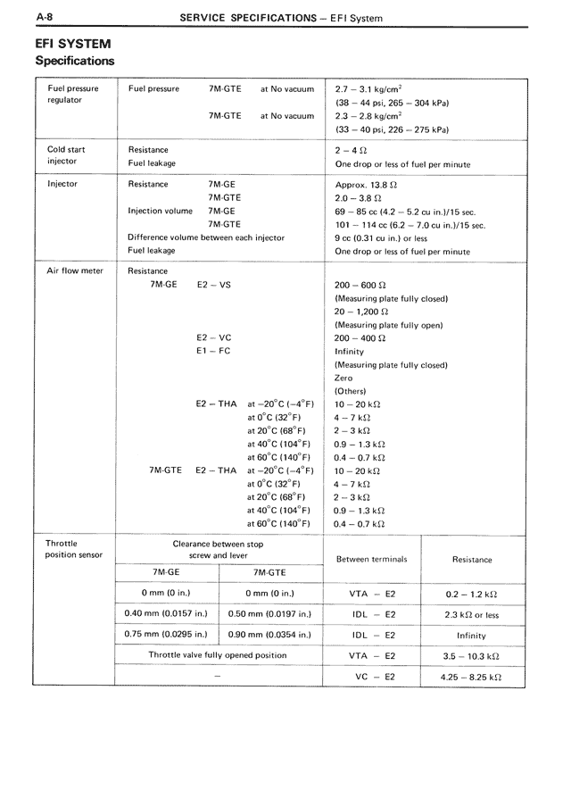 Fuel pressure regulator | Fuel pressure | 7M·GTE | at No vacuum | 2.7 — 3.1 kg/cm² (38 — 44 psi, 265 — 304 kPa)