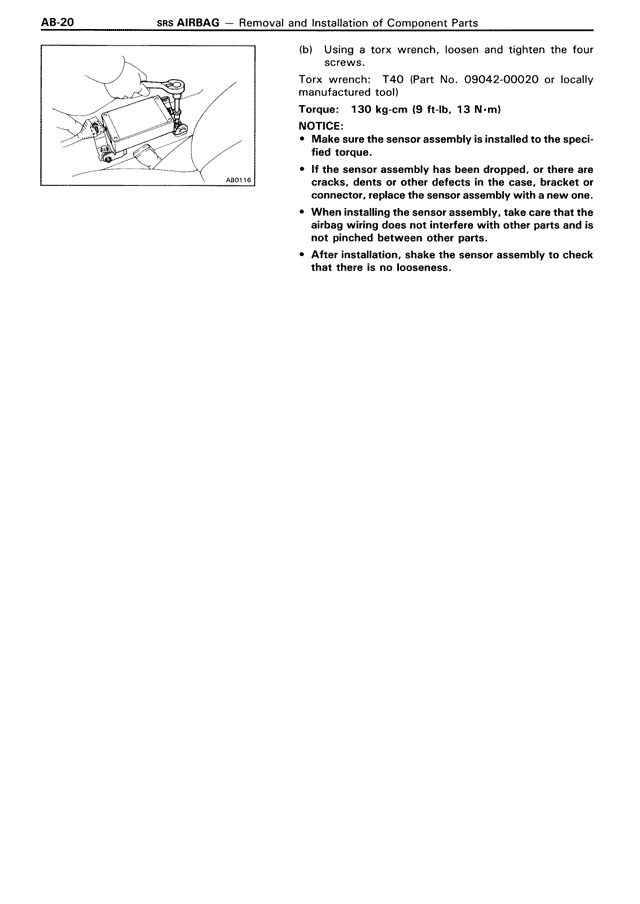 • When installing the sensor assembly, take care that the airbag wiring does not interfere with other parts and is not pinched between other parts.