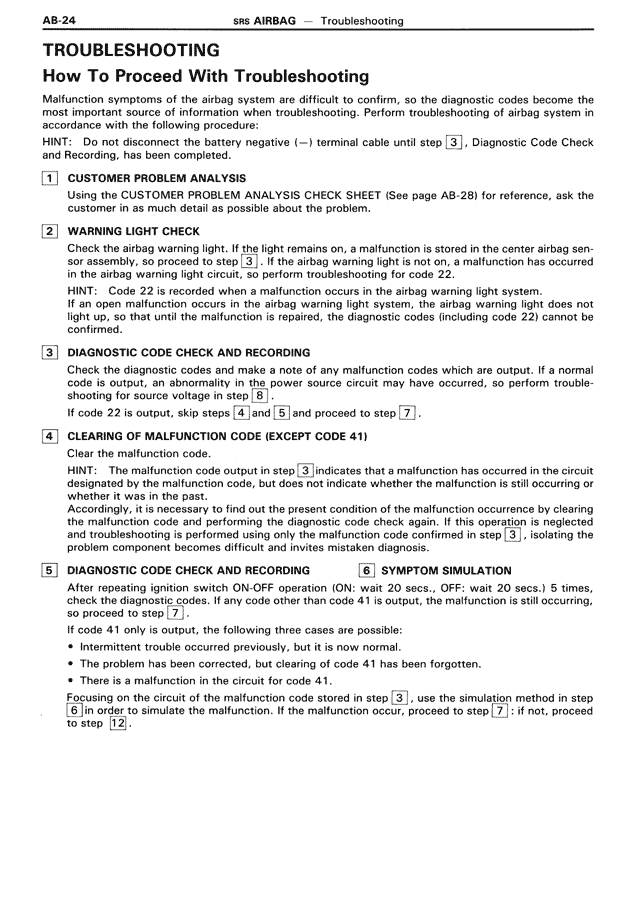 Malfunction symptoms of the airbag system are difficult to confirm, so the diagnostic codes become the most important source of information when troubleshooting. Perform troubleshooting of airbag system in accordance with the following procedure: