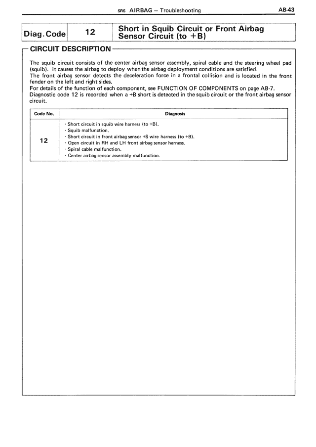 Diagnostic code 12 is recorded when a +B short is detected in the squib circuit or the front airbag sensor circuit.