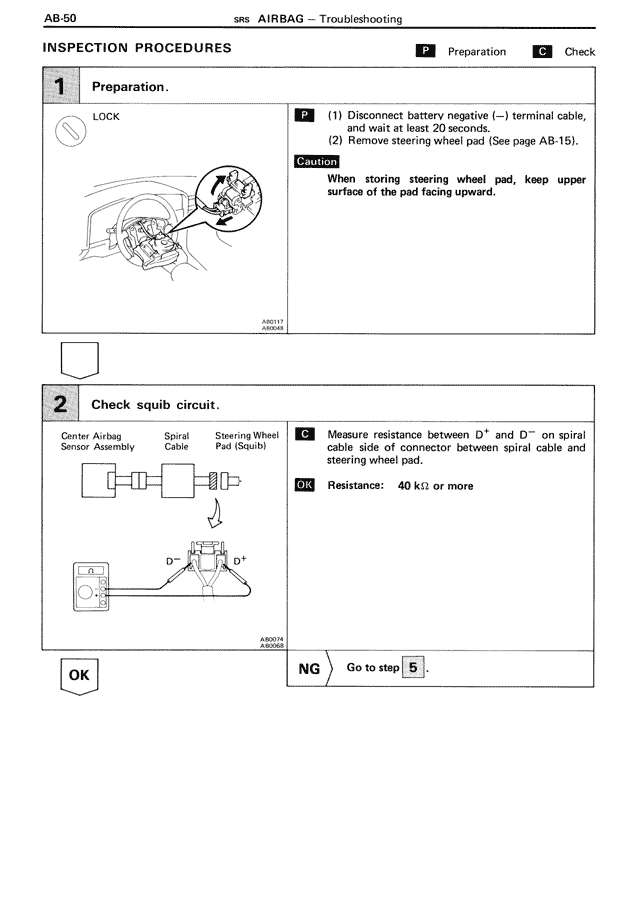 C Measure resistance between D+ and D— on spiral cable side of connector between spiral cable and steering wheel pad.