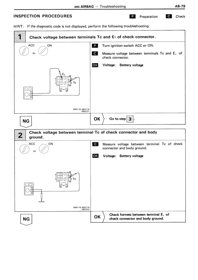 1 Check voltage between terminals Tc and E1 of check connector.