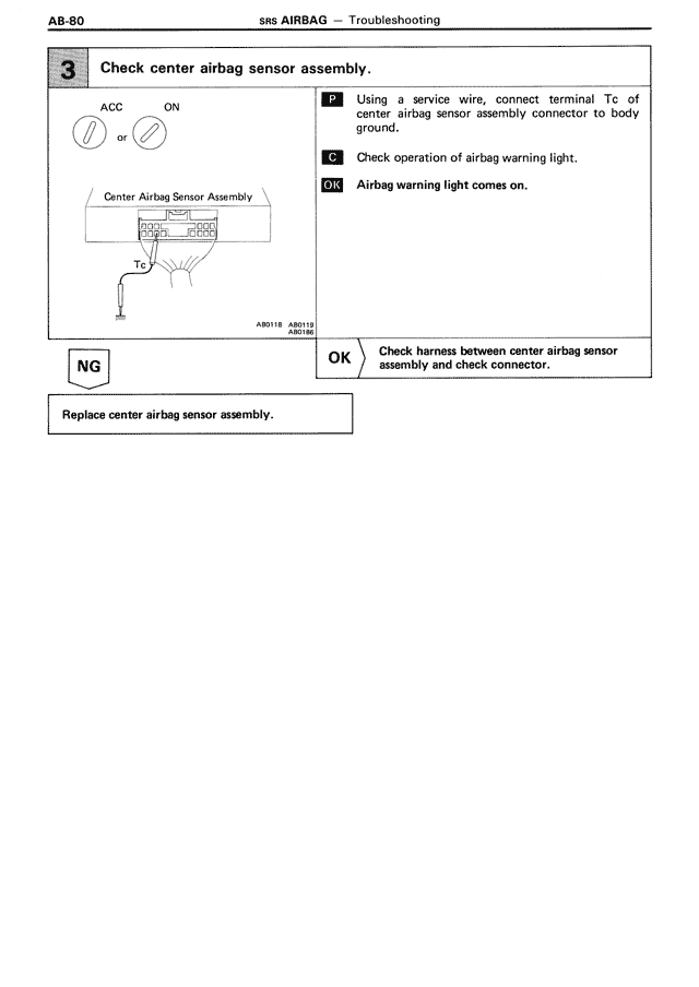 P Using a service wire, connect terminal Tc of center airbag sensor assembly connector to body ground.
