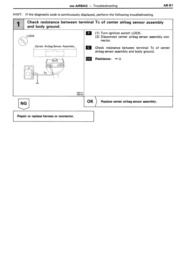1 Check resistance between terminal Tc of center airbag sensor assembly