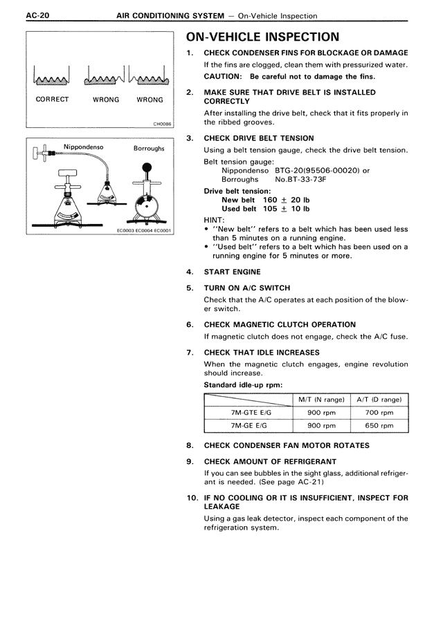 [DIAGRAMS SHOWING: Three waveform patterns labeled "CORRECT", "WRONG", "WRONG" with CHO086 reference number, and belt tension gauge diagrams showing Nippondenso and Borroughs configurations with reference number EC0063,EC0634,D0061]