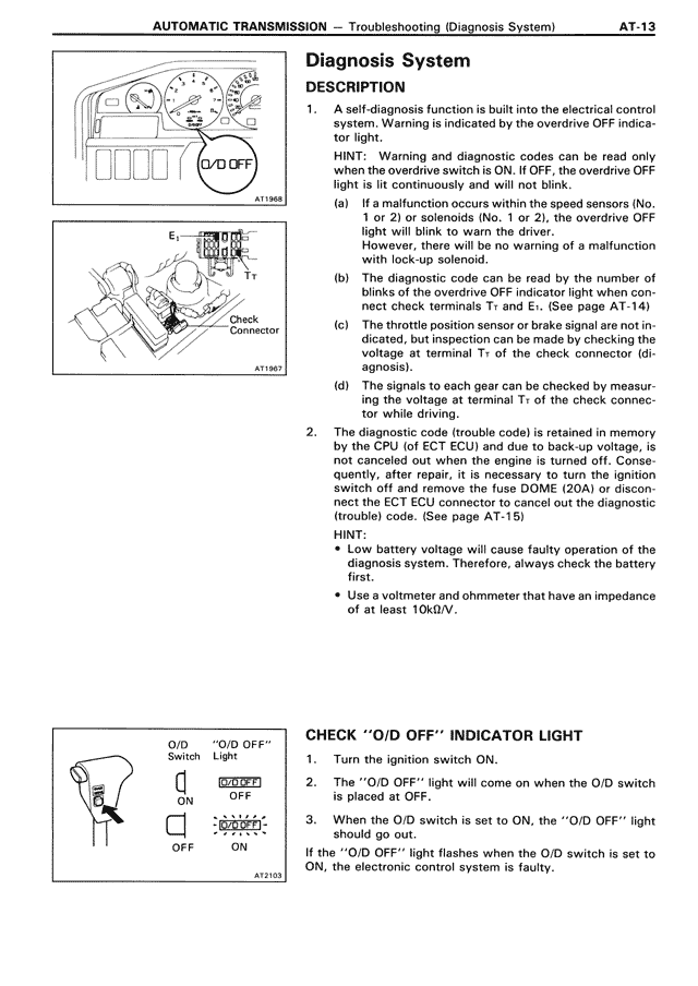 (b) The diagnostic code can be read by the number of blinks of the overdrive OFF indicator light when connect check terminals T1 and E1. (See page AT-14)