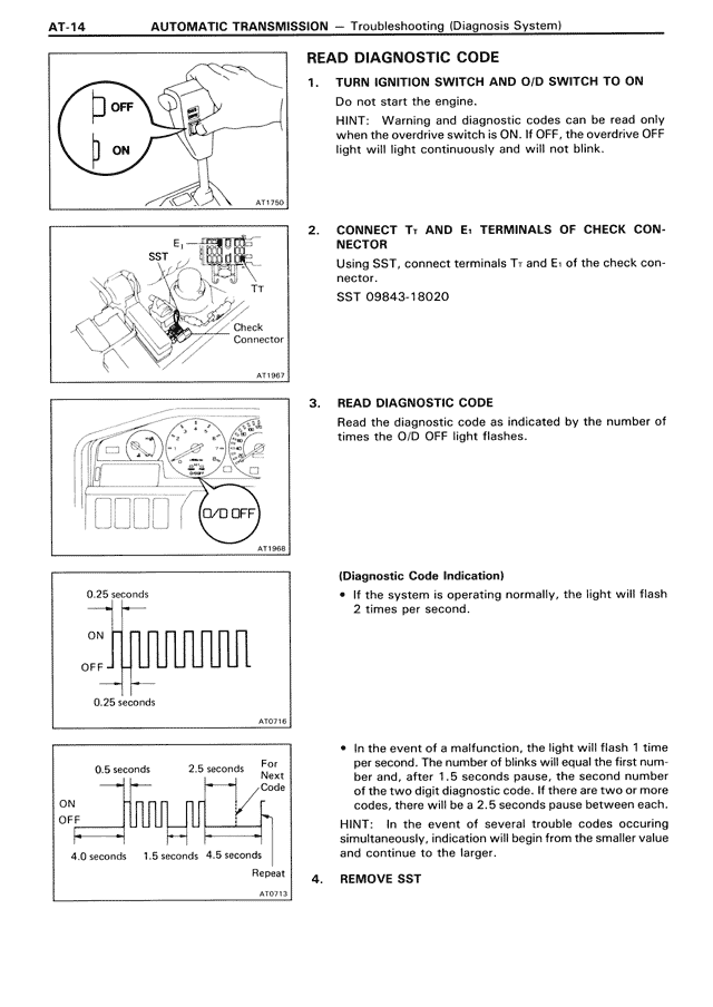HINT: Warning and diagnostic codes can be read only when the overdrive switch is ON. If OFF, the overdrive OFF light will light continuously and will not blink.
