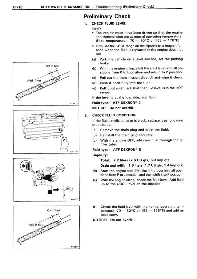 • The vehicle must have been driven so that the engine and transmission are at normal operating temperature. (Fluid temperature: 70 — 80°C or 158 — 176°F)