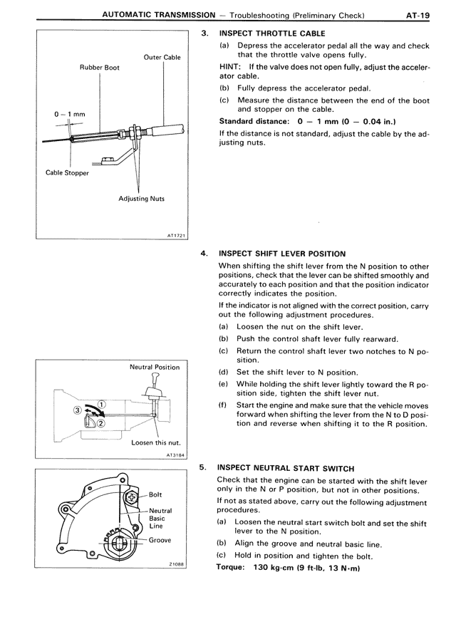 (f) Start the engine and make sure that the vehicle moves forward when shifting the lever from the N to D position and reverse when shifting it to the R position.