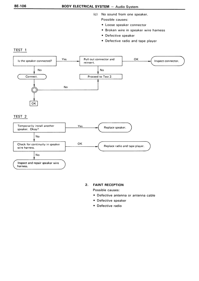 Check for continuity in speaker wire harness. → OK → Replace radio and tape player.