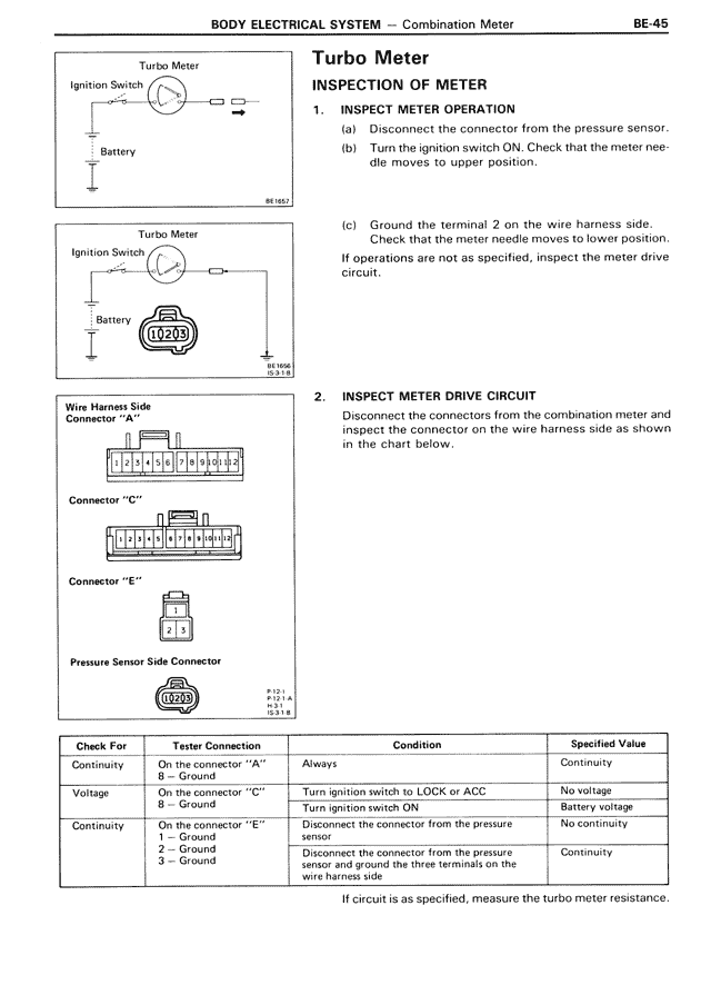 (c) Ground the terminal 2 on the wire harness side. Check that the meter needle moves to lower position.