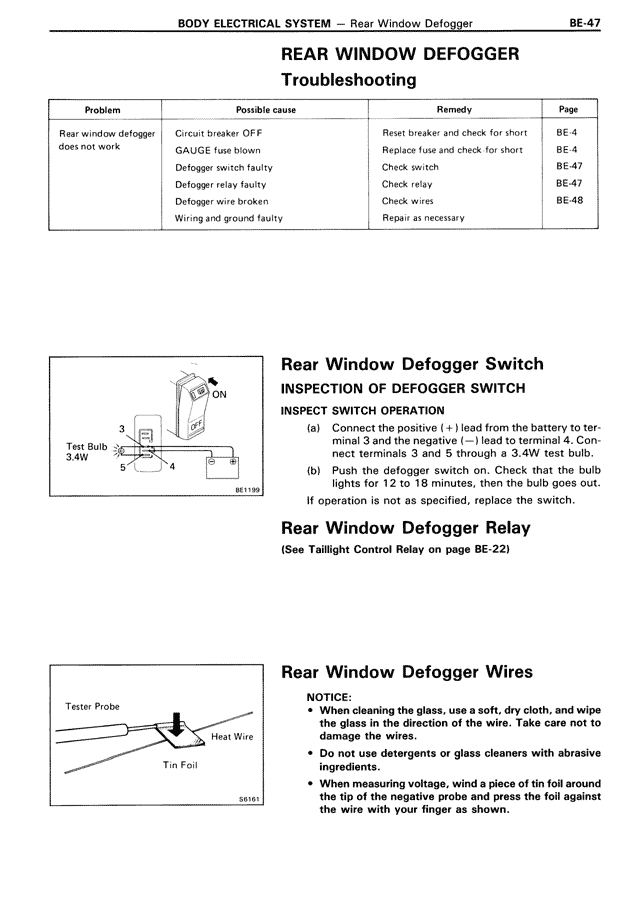 Rear window defogger does not work | Circuit breaker OFF | Reset breaker and check for short | BE-4