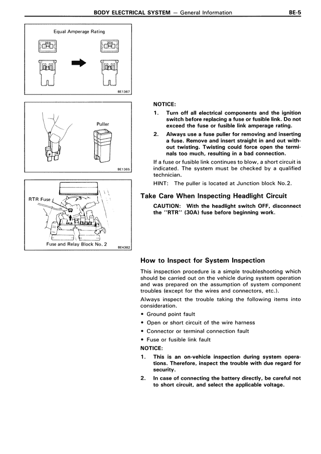 1. Turn off all electrical components and the ignition switch before replacing a fuse or fusible link. Do not exceed the fuse or fusible link amperage rating.