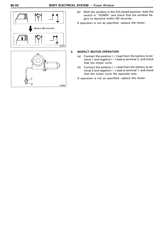 (b) With the window in the full closed position, hold the switch in "DOWN" and check that the window begins to descend within 60 seconds.