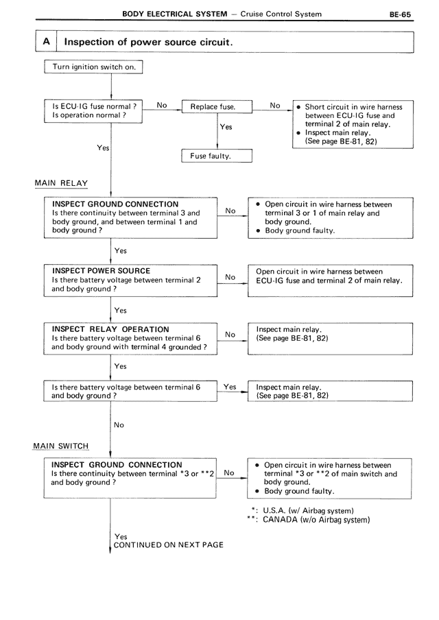 No → Open circuit in wire harness between ECU-IG fuse and terminal 2 of main relay.